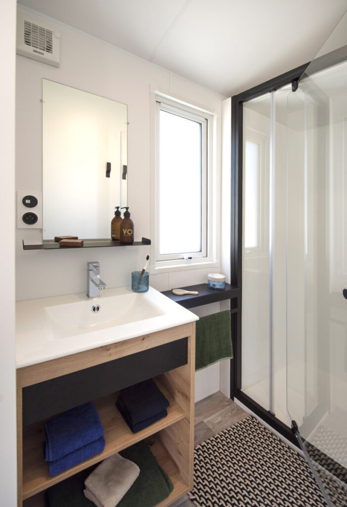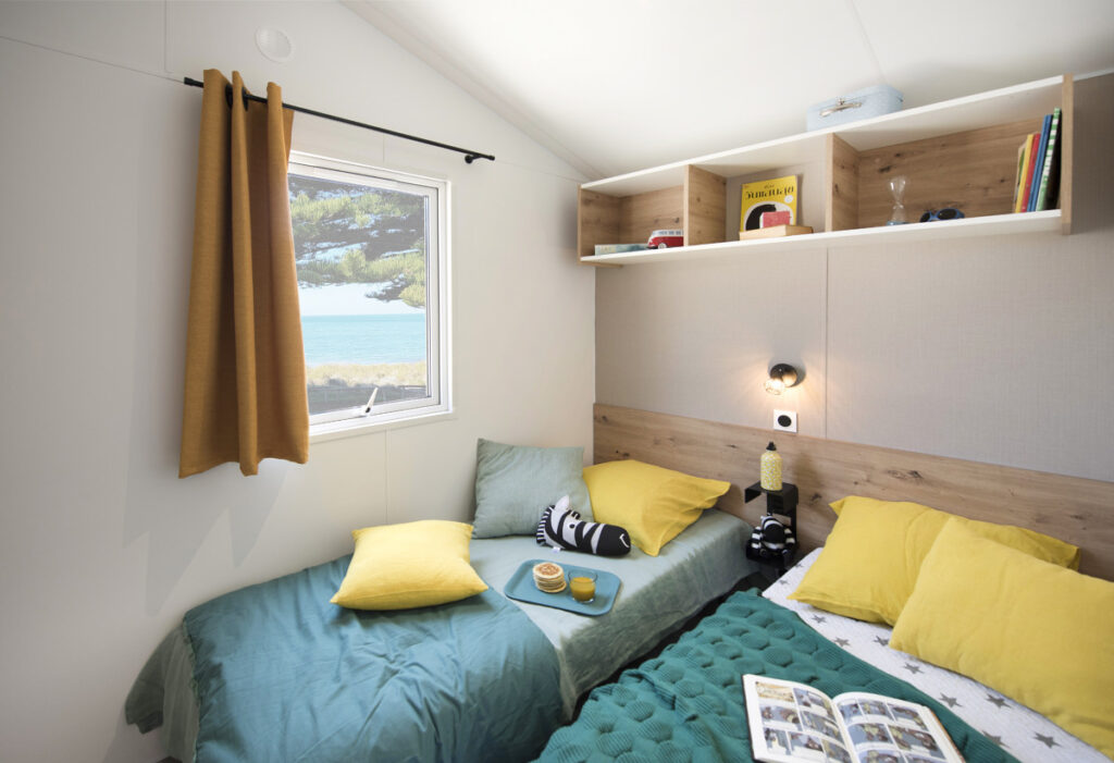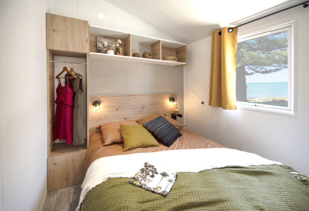 25 m² mobile home for 2-4 people, with integrated terrace, less than 5 years. Living space: 2 bedrooms for small families, ideal for a couple and 2 children.
